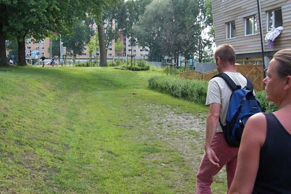 Waarom hier geen pad achter de woningen en richting kruispunt (de heuvel op)?